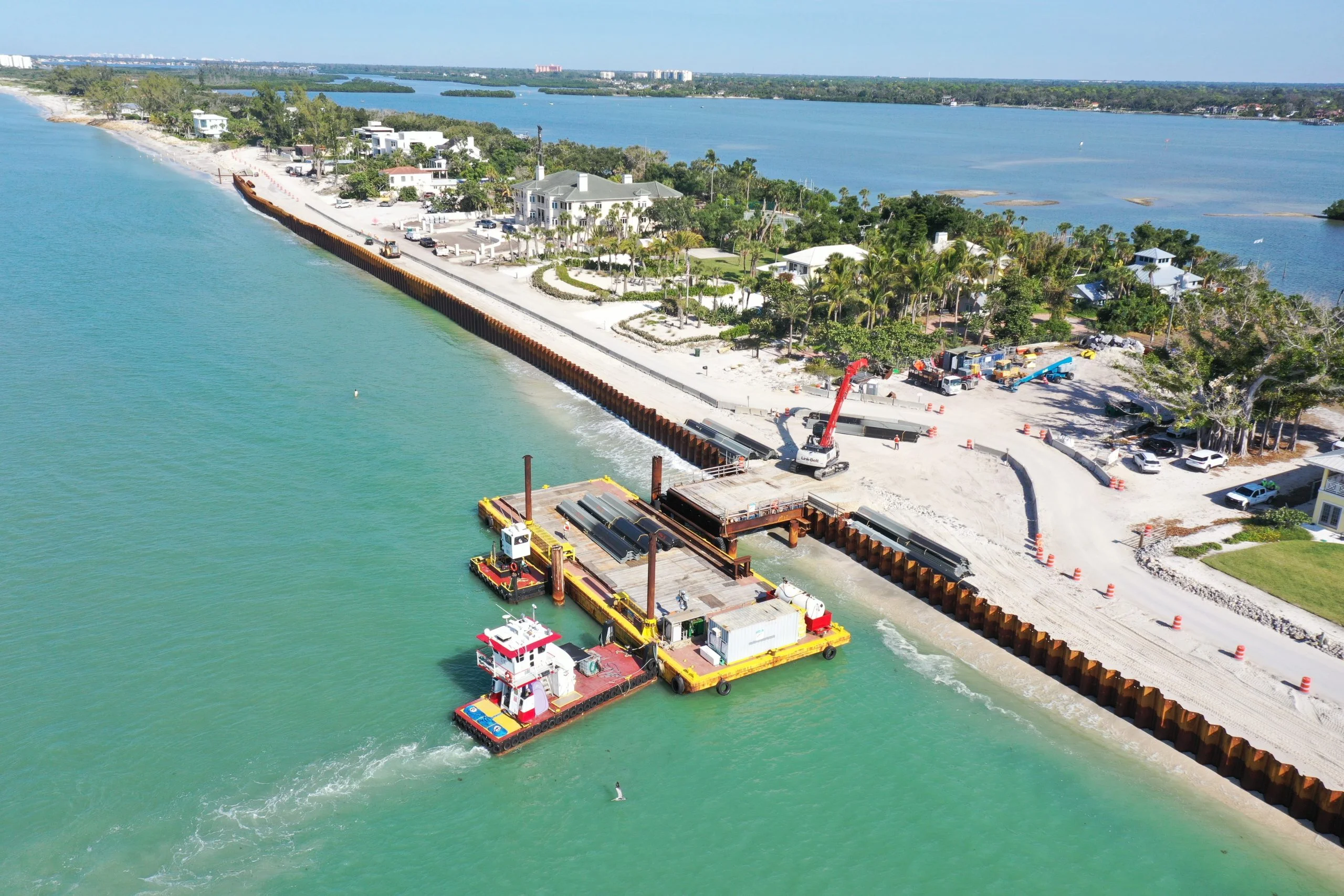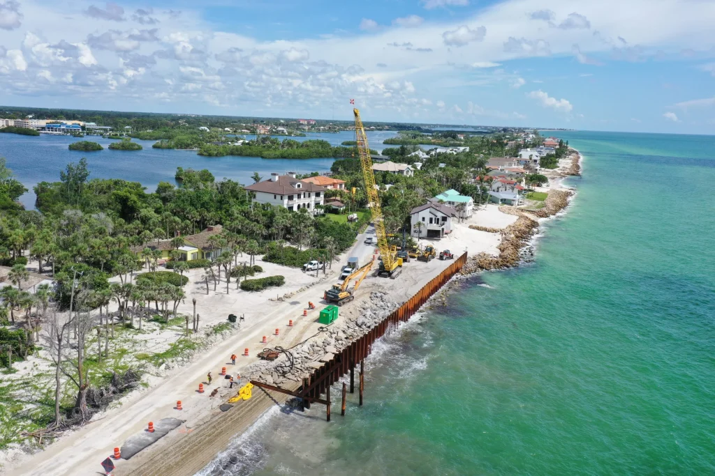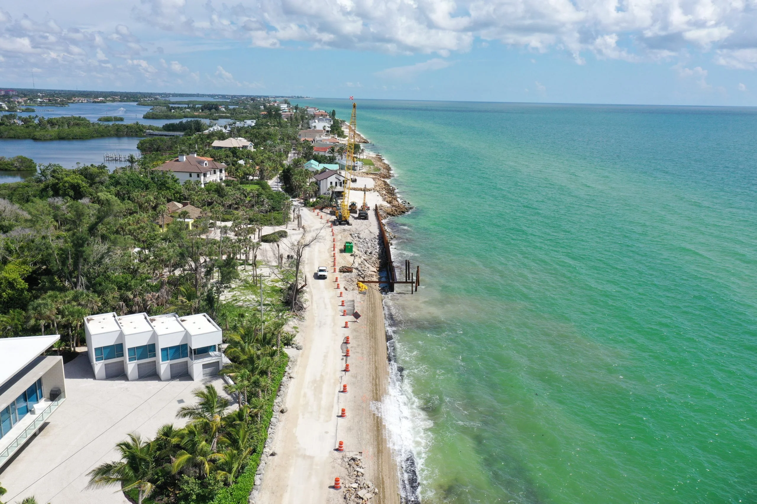 This project involves the reconstruction and coastal resiliency improvement of two heavily damaged sections of North Casey Key Road in Sarasota County, Florida. Following severe coastal erosion and storm damage, the roadway experienced significant undermining and failure of the existing shoreline protection system. The work includes installation of a new permanent seawall and shoreline protection system—replacing the deteriorated revetment with granite rip-rap, steel sheet piling, and temporary bulkhead measures to stabilize the coastline. Once the shoreline is secured, the road will be rebuilt with a reinforced subgrade, new road base, and improved drainage to prevent future voiding beneath the pavement. The project will be delivered in phases, beginning with temporary stabilization and seawall construction, followed by permanent roadway reconstruction and final site restoration. Construction staging, traffic control and temporary access measures will ensure residents maintain safe access throughout the project. Funded through a combination of FEMA, state, and county contributions, this multi-year effort focuses on long-term durability and coastal resilience, restoring the roadway while protecting the shoreline from future storm impacts.